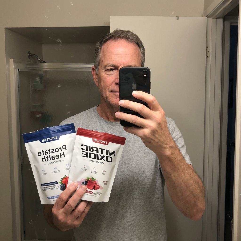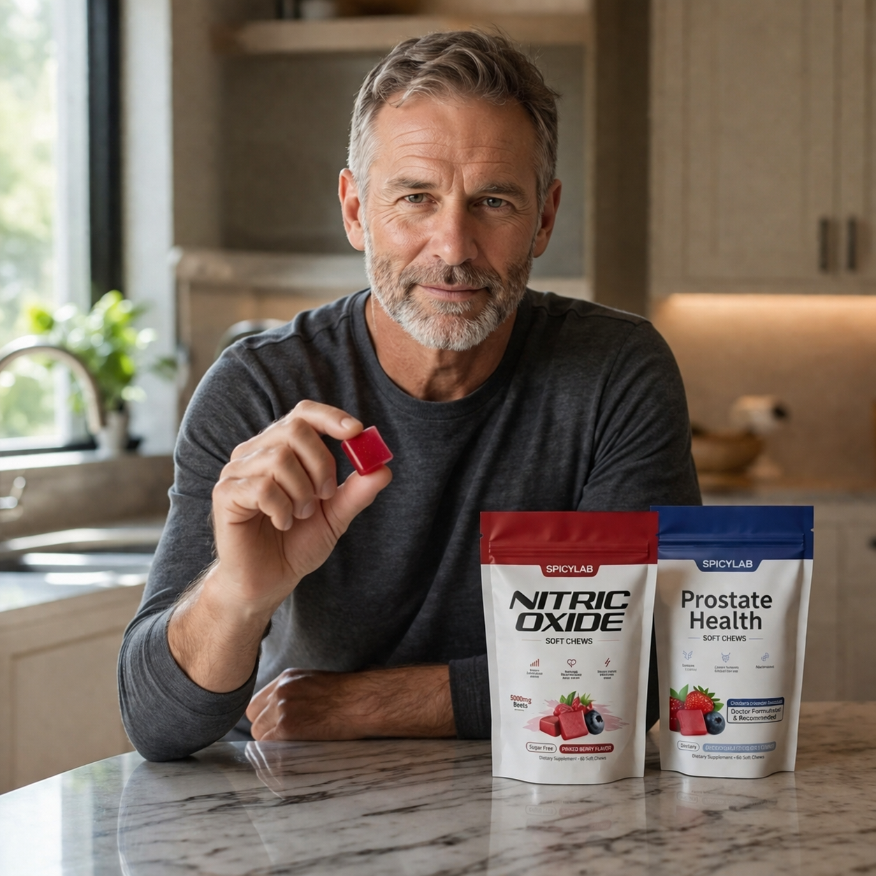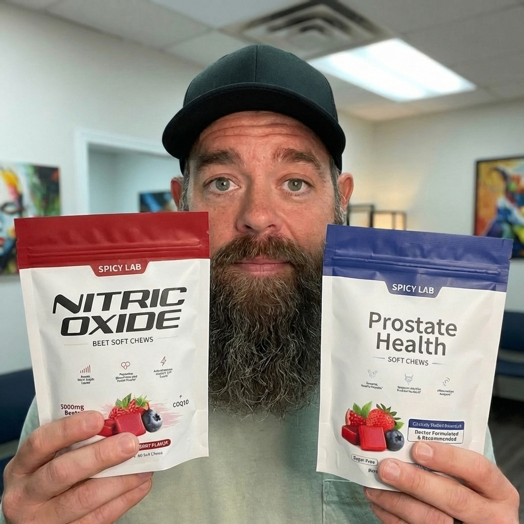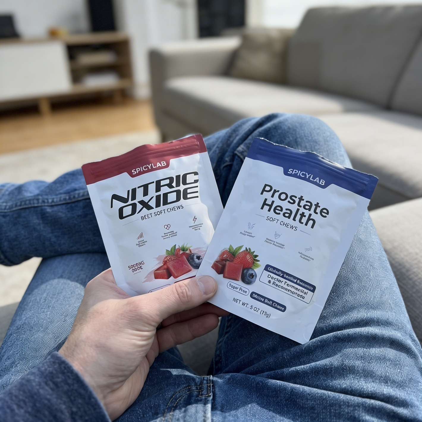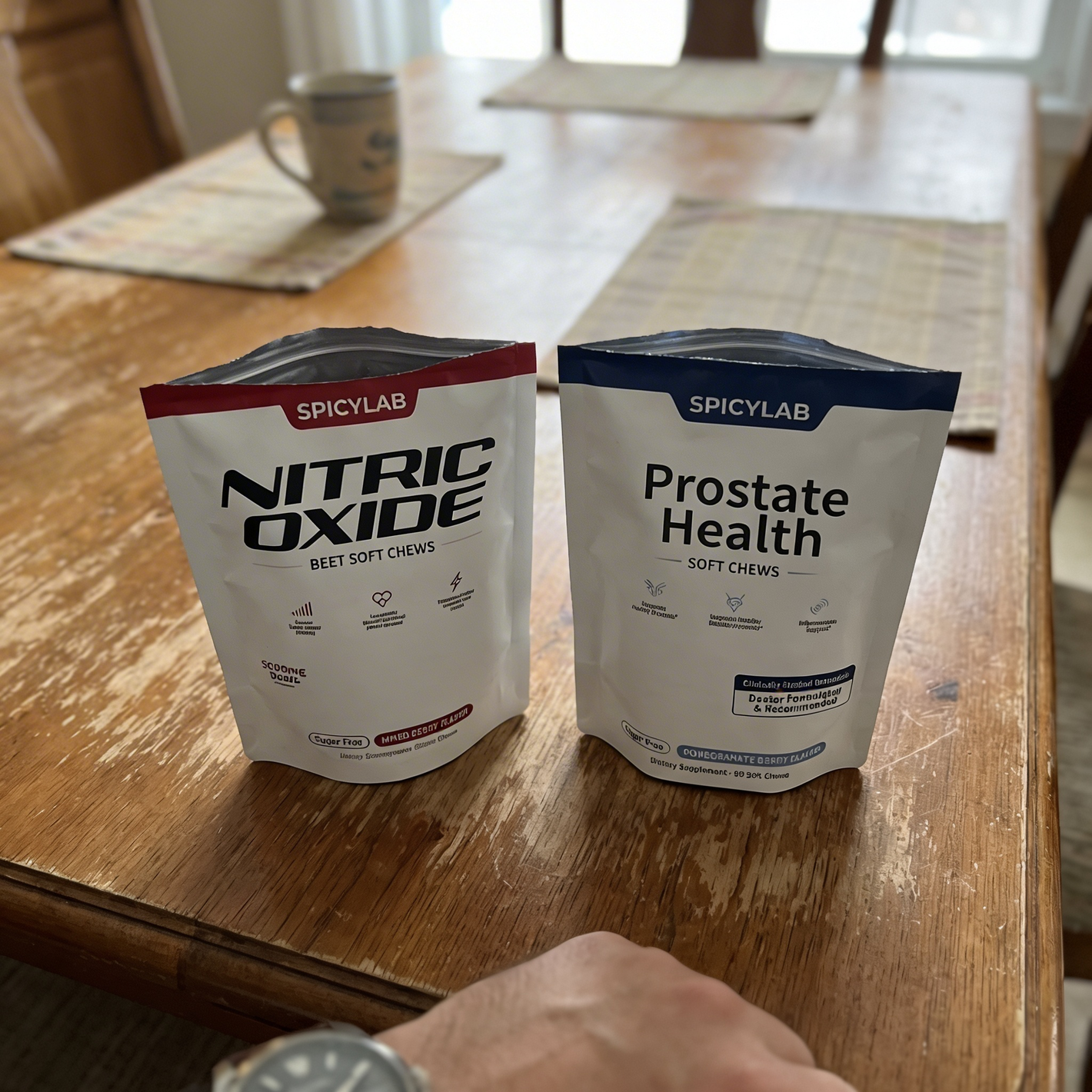 The Prostate Health Chew shrinks the inflammation and clears the compression. The Nitric Oxide Chew rebuilds the blood flow your erections run on — with nothing blocking it this time.